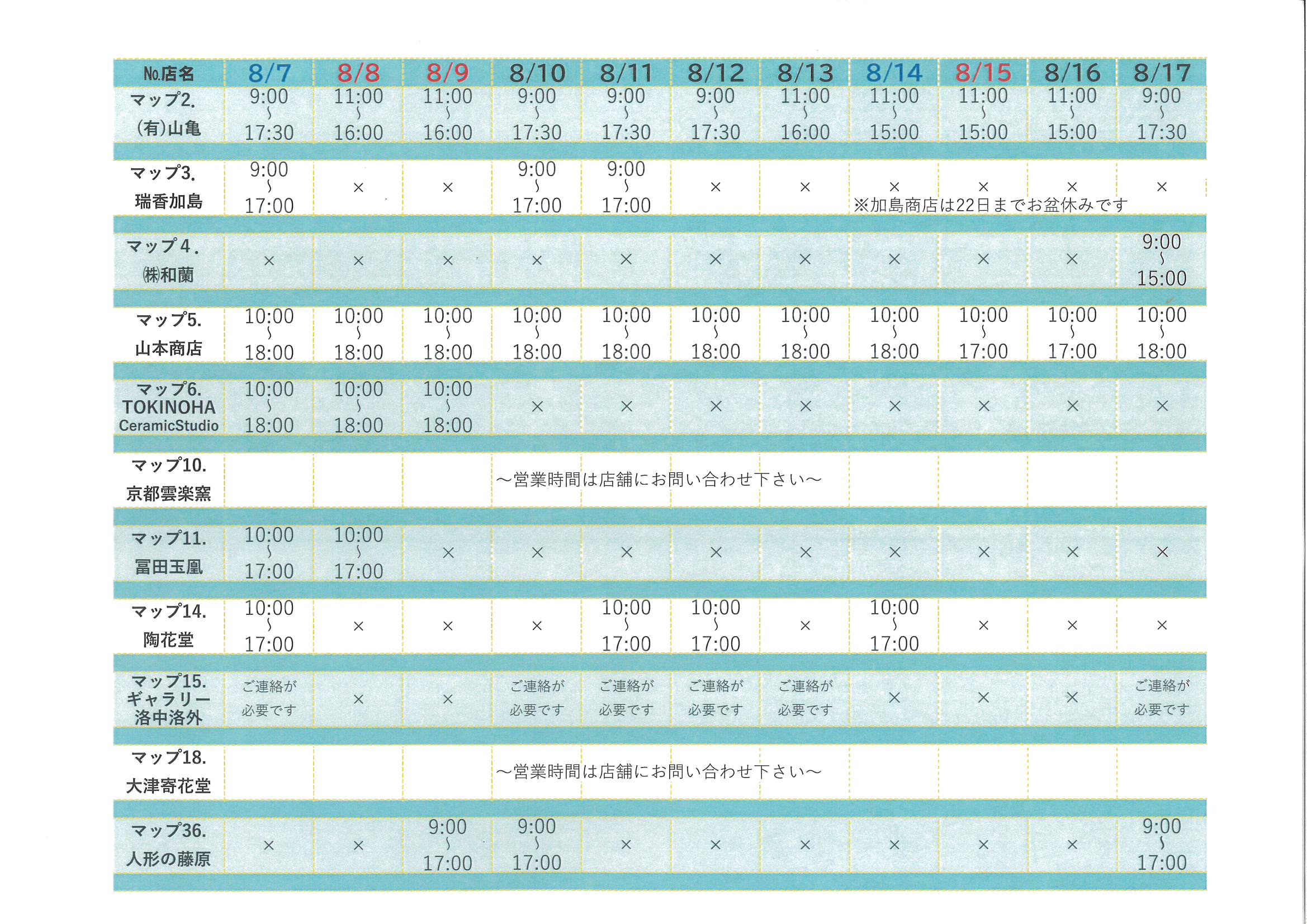 清水焼団地内の各店舗の営業日につきましは、以下をご覧ください。