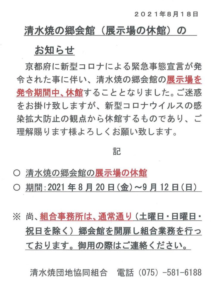 清水焼の郷会館のお知らせ