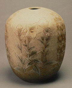 絵付けで花を描くのではなく、彫刻科で学んだ経験を生かして陶器の表面に花々をヘラで彫刻していくのも、寺池さんの作品の特徴だ。花びらもそのまま写すのではなく、装飾性を考えながら自分流にアレンジしていく。