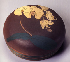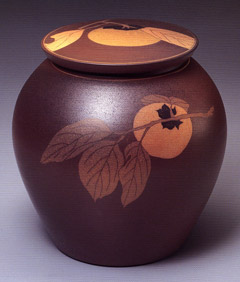 今井さんは、陶芸に象嵌技法を取り入れた第一人者として、「象嵌の今井」と称される作家でもある。象嵌とは、土に別の色土を嵌めこんで焼くという技。土は焼くと縮む性質があり、その収縮率は土それぞれに違うもの。嵌める際、土の収縮率を計算しておかないと、隙間ができたりひびが入ってしまうのだ。そういう困難に加え、今井さんが挑戦したのは、面の象嵌。線を象嵌する陶器はあるものの、より嵌めこみ範囲の広い面象嵌は、今井さんが10数年もの歳月をかけて始めて実現させた分野だ。