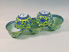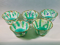 陶花堂で特徴的なのは、割烹食器を始めとする器たちが、京焼の流れを汲むものであること。京焼とは、一般的に、江戸時代に活躍した陶工、野々村仁清、仁清の弟子であり琳派の尾形乾山らが確立した色絵陶器や、唐草、法曹華といった、中国明代に影響を受けた花鳥文様=「祥瑞(しょうずい)文様」が描かれた「呉須」、「呉須赤絵」などのこと。広く愛されてきた先人たちの意匠の“写し”を陶花堂は手掛けている。