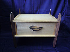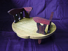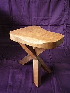 森さんは、受注生産で美術木箱を手掛ける傍ら、作品制作にも力を注いでいる。美術木箱は桐、杉、モミが中心となるが、作品用は材木屋から集めてきた端材が素材。ケヤキ、黒柿、赤杉、ウォールナット、黒檀、神代杉など、その時々に出会った端材を使い、手を動かしながら、椅子、タバコ盆、電話台などの作品に仕上げていく。