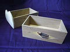 「木は生きているもんでもあるから、繊維の密度も木目もそれぞれ違うし、木の性格も違う。自分の言うことを聞いてくれるわけではないので、木と話をし、気を使いながら、思い通りの形に近づけていかねばなりません。」木目や癖など、その木の雰囲気を見ながらデザインや遊びを加えていくのが森さんだ。それが、物を納めるための木箱に留まることなく、単体で主張する存在感を生む。最近では、草木染の染料で木を染めたり、他業種の研究会に参加するなど、木の可能性を探る日々だ。