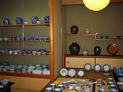 作家の手塚央さん、加藤雲泉さん、馬場京泉さん、双楽窯の品々が所狭しと無造作に置かれている。丹念に描かれた古典紋様の染め付けの食器類が重厚で存在感があり、お店の魅力の一因となっている。