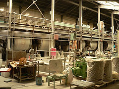 陶石を細かく砕く粉砕機、精製して不純物を取り除いた後、水分を絞り取るフィルタープレス、空気を除去する真空土練機など、工場内には巨大な機械が整然と並ぶ。完全な流れ作業の体制から、質のいい粘りのある粘土が生まれる。